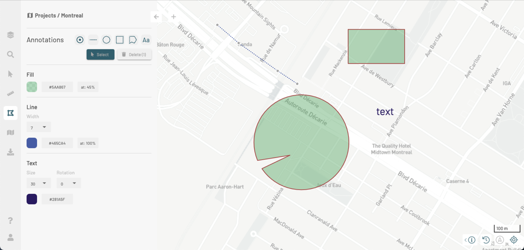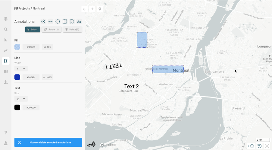 4. Depending on the type of annotation in your selection, and using the **Fill**, **Line** and **Text** tools, change the appearance of the annotations. The changes will be displayed on the map.