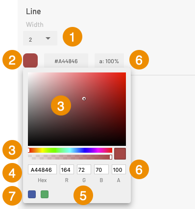 <table data-header-hidden><thead><tr><th width="89"></th><th></th></tr></thead><tbody><tr><td><strong>1</strong></td><td><strong>Width</strong> <br>To define the width of the line, select a value in the drop-down list.</td></tr><tr><td><strong>2</strong></td><td>This box displays the color selected for the line and its level of transparency. <br>1. Click on the box to open the line color selection tool. <br>This tool offers several ways to define the color.</td></tr><tr><td><strong>3</strong></td><td>Visual tools to select the color: <br>1. Select the color in the color bar by sliding the cursor. <br>2. Select the shade in the color field by sliding the point. <br>The selected color is displayed in the Hex and RGB fields and also appears in the color box.</td></tr><tr><td><strong>4</strong></td><td>Hexadecimal (hex) code of the selected color. <br>1. Enter the hexadecimal code in the Hex field. <br>The color you enter is shown in the box, in the colored bar, in the color field and in the RGB indicators. <br>The Hexadecimal code is displayed in the <strong>Line</strong> section at all times.</td></tr><tr><td><strong>5</strong></td><td>The color is also set using the RGB code. <br>1. Enter the <strong>R</strong>, <strong>G</strong> and <strong>B</strong> values of the desired color. <br>All the color indicators display the selected color.</td></tr><tr><td><strong>6</strong></td><td>This field shows the level of opacity of the line. <br>1. Select the line's opacity level in the second bar by sliding the cursor. <br>Sliding the cursor completely to the right allows you to reach maximum opacity, and sliding it all the way to the left will set the value to maximum transparency.<br>You can also enter the value directly in the <strong>A</strong> box. <br>The level of opacity is displayed at all times as a percentage value in the <strong>Line</strong> section.</td></tr><tr><td><strong>7</strong></td><td>The last selected colors are kepeed in memory.</td></tr></tbody></table>