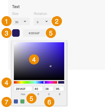 <table data-header-hidden><thead><tr><th width="88"></th><th></th></tr></thead><tbody><tr><td><strong>1</strong></td><td><strong>Size</strong> <br>To set the font size, select a value in the drop-down list.</td></tr><tr><td><strong>2</strong></td><td><strong>Rotation</strong> <br>Indicate the rotation angle you wish to apply to the text.</td></tr><tr><td><strong>3</strong></td><td>This box displays the color selected for the text. <br>1. Click on the box to open the text color selection tool. <br>This tool offers several ways to define the color.</td></tr><tr><td><strong>4</strong></td><td>Visual tools to select the color: <br>1. Select the color in the color bar by sliding the cursor. <br>2. Select the shade in the color field by sliding the point. <br>The selected color is displayed in the Hex and RGB fields and also appears in the color box.</td></tr><tr><td><strong>5</strong></td><td>Hexadecimal (hex) code of the selected color. <br>1. Enter the hexadecimal code in the Hex field. <br>The color you enter is shown in the box, in the colored bar, in the color field and in the RGB indicators. <br>The Hexadecimal code is displayed in the <strong>Text</strong> section at all times.</td></tr><tr><td><strong>6</strong></td><td>The color is also set using the RGB code. <br>1. Enter the <strong>R</strong>, <strong>G</strong> and <strong>B</strong> values of the desired color. <br>All the color indicators display the selected color.</td></tr><tr><td><strong>7</strong></td><td>The last selected colors are kepeed in memory.</td></tr></tbody></table>