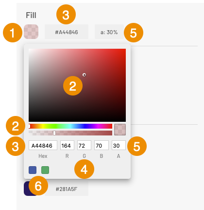 <table data-header-hidden><thead><tr><th width="81"></th><th></th></tr></thead><tbody><tr><td><strong>1</strong></td><td>This box shows the selected color and its level of transparency. <br>1. Click on the box to open the fill color selection tool. <br>This tool offers several ways to define the color.</td></tr><tr><td><strong>2</strong></td><td>Visual tools to select the color: <br>1. Select the color in the color bar by sliding the cursor. <br>2. Select the shade in the color field by sliding the point. <br>The selected color is displayed in the Hex and RGB fields and also appears in the color box.</td></tr><tr><td><strong>3</strong></td><td>Hexadecimal (hex) code of the selected color. <br>1. Enter the hexadecimal code in the Hex field. <br>The color you enter is shown in the box, in the colored bar, in the color field and in the RGB indicators. <br>The Hexadecimal code is displayed in the <strong>Fill</strong> section at all times.</td></tr><tr><td><strong>4</strong></td><td>The color is also set using the RGB code. <br>1. Enter the <strong>R</strong>, <strong>G</strong> and <strong>B</strong> values of the desired color. <br>All the color indicators display the selected color.</td></tr><tr><td><strong>5</strong></td><td>This field shows the level of opacity of the fill color. <br>1. Select the level of opacity in the second bar by sliding the cursor. <br>Sliding the cursor completely to the right allows you to reach maximum opacity, and sliding it all the way to the left will set the value to maximum transparency. <br>You can also enter the value in the <strong>A</strong> box. <br>The level of opacity is displayed at all times as a percentage value in the <strong>Fill</strong> section.</td></tr><tr><td><strong>6</strong></td><td>The last selected colors are kepeed in memory.</td></tr></tbody></table>
