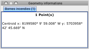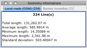 This tool allows you to obtain information on the geometry of the map's elements. The information varies according to the type of geometry (point, line, polygon, etc.) and the number of selected elements. Select one or more elements on the map and click on the button for this tool.