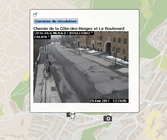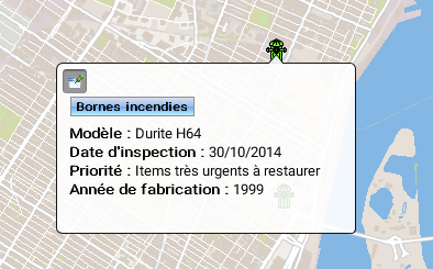 Mouseover bubbles contain information on map elements. They are automatically displayed when the mouse pointer remains on the elements of certain layers. Mouseover bubbles can contain attribute values, links to web pages, images, etc. When several elements are superimposed, mouseover bubbles display the information for all the elements, grouped by layer.