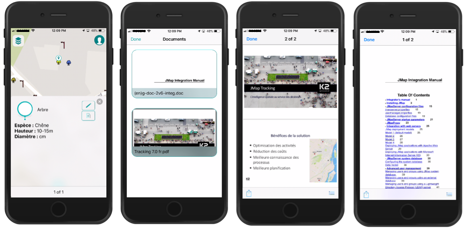 Some layers have descriptive information associated with layer elements or objects. The information is displayed in tooltips. In addition, if the **Documents** extension is found on the JMap server and you have the required permissions, a button in the tooltip will allow you to access the documents associated with the object. You can open and view the documents directly on your mobile device.