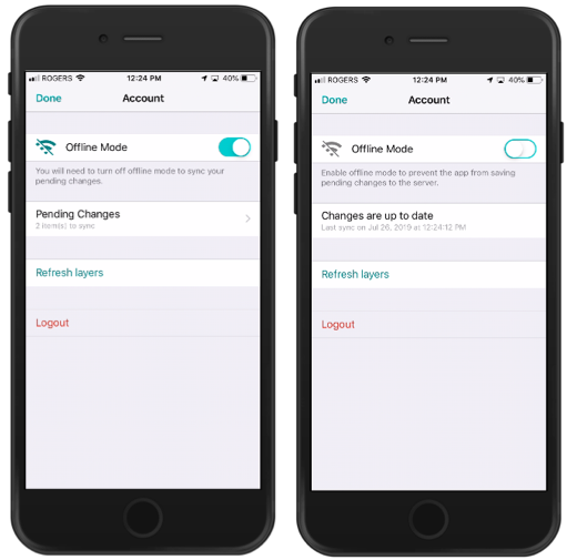If you are working offline, when a network connection becomes available, disable Offline Mode in the Account screen. The changes you have made will be automatically synchronized. Note: The project's layer data may have been updated or modified on the JMap server. By touching Refresh layers, JMap Survey will download all of the data once again to make sure it is up-to-date on your device. This option is not required to save the changes you made with JMap Survey, but you should use it from time to time.