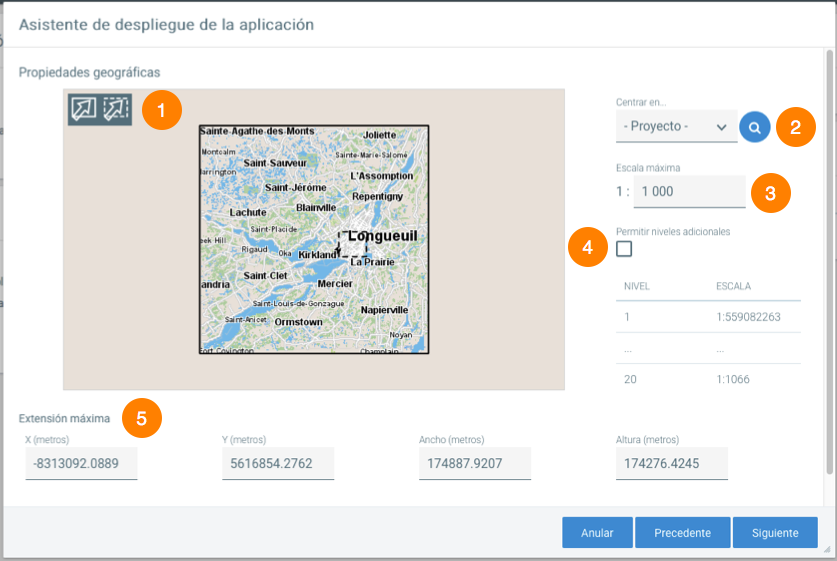 <table data-header-hidden><thead><tr><th width="73.5"></th><th></th></tr></thead><tbody><tr><td><strong>1</strong></td><td>Utilice estas herramientas para redefinir las extensiones inicial y máxima si lo necesita. Por defecto se utilizan las extensiones del proyecto. Limitar la extensión máxima del mapa puede reducir marcadamente el volumen de datos en caché para este tipo de aplicaciones. La extensión máxima está representada por la línea de trazo pleno. La extensión inicial está representada por la línea de trazo puntillado.</td></tr><tr><td><strong>2</strong></td><td><strong>Centrar en…</strong><br>Esta función permite buscar datos en el mapa. En ciertos casos, las extensiones conocidas en JMap pueden ser incorrectas y el mapa que se visualiza por defecto puede aparecer como vacío. Para ayudarle a localizar correctamente los datos, usted puede utilizar esta herramienta para hacer zoom en la extensión de una capa en particular o sobre la extensión del proyecto completo. Una vez que los datos han sido localizados correctamente, usted puede redefinir extensiones inicial y máxima válidas.</td></tr><tr><td><strong>3</strong></td><td><strong>Escala máxima</strong><br>Este parámetro permite redefinir la escala máxima del mapa para limitar las posibilidades de ampliación del mismo por parte del usuario. Por defecto, se utiliza la escala máxima definida en la configuración del proyecto pero se puede especificar otra escala. Especificar una escala máxima más pequeña permite reducir considerablemente el volumen de los datos en caché de este tipo de aplicación.</td></tr><tr><td><strong>4</strong></td><td><strong>Nivel / Escala</strong><br>Muestra la lista de los niveles de zoom y las escalas que se utilizarán en la aplicación. Los niveles son determinados de acuerdo a los valores de los parámetros escala máxima y extensión máxima que se hayan establecido.<br><strong>Permitir niveles adicionales</strong><br>Esta opción permite a JMap Web, en ciertos casos particulares, publicar el mapa en escalas más grandes (zoom más cerca) que las utilizadas normalmente. La escala máxima utilizada con más frecuencia es 1:1000. Si la escala máxima definida más arriba es superior a 1:1000 (1:500 por ejemplo), debe seleccionar esta opción para permitir a JMap Web a hacer un zoom a esa escala.<br>La mayoría de los mapas base (Google Maps, Bing Maps, OSM, Mapbox) no se visualizan de manera óptima a escalas superiores a 1:1000.</td></tr><tr><td><strong>5</strong></td><td><strong>Extensión máxima</strong><br>Los parámetros de la extensión máxima se publican en la parte inferior del mapa (la coordenada X, Y del punto inferior izquierdo, ancho y altura, en el sistema de coordenadas del proyecto). Puede también ingresar los parámetros directamente en los campos pertinentes.</td></tr></tbody></table>