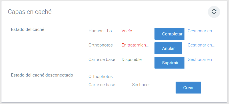 Para cada capa, presione Completar para comenzar la producción del caché del mosaico. Este proceso puede ser anulado presionando Anular. Para suprimir el caché de una capa, presione el botón Suprimir. La producción del caché puede demandar mucho tiempo. Si desea manejar el caché directamente en la interfaz de GeoWebCache, presione Gestionar en GeoWebCache.
