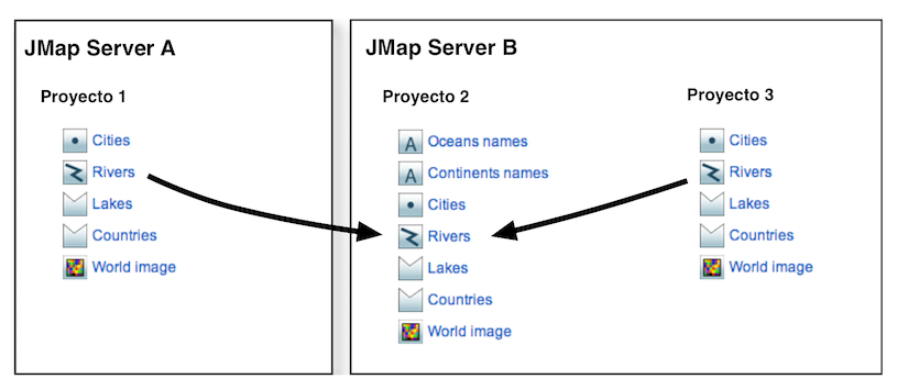 La figura ilustra el uso compartido de capas entre proyectos de un mismo servidor y de servidores distintos. Las propiedades de la capa Rivers no pueden ser modificadas en los proyectos 1 y 3. La capa original es la del proyecto 2.