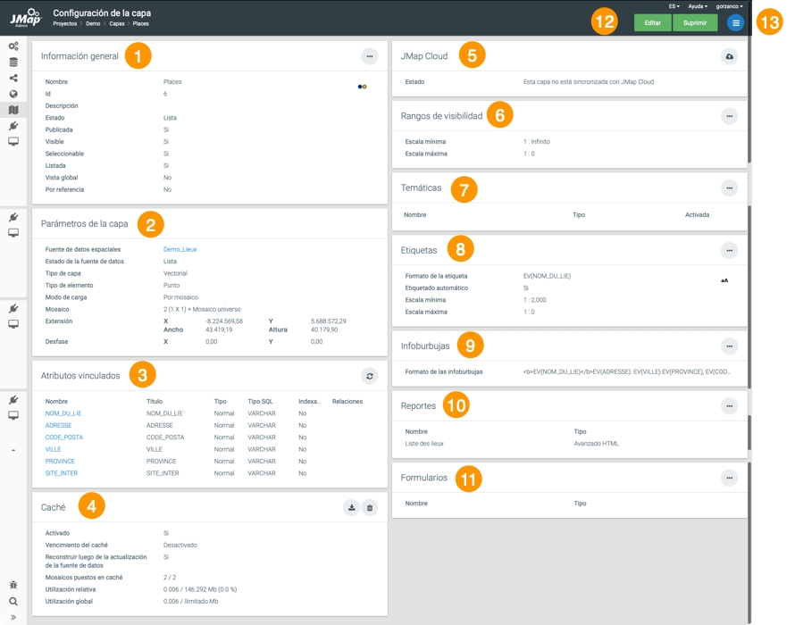 Información general configurada al crear la capa. El botón permite acceder directamente a la interfaz de configuración de los parámetros de la sección.