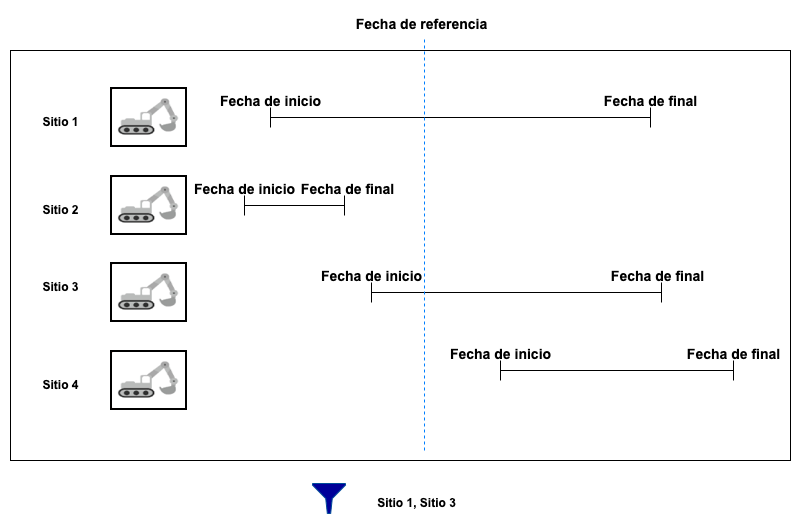 Sólo se visualizan en el mapa los elementos de la capa cuya fecha de referencia está incluida entre la fecha de inicio y la fecha de final.