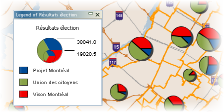 Estas temáticas generan gráficos circulares que se visualizan en el centro de los elementos que califican. Este tipo de temáticas funciona con uno o más atributos numéricos. Cada porción del círculo representa un atributo diferente . El tamaño del gráfico es proporcional a la suma de los valores de todos los atributos. Este tipo de temáticas sólo puede utilizarse con atributos numéricos.