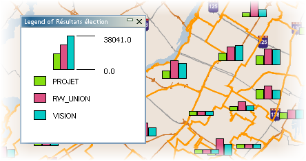 Estas temáticas dibujan gráficos de barras en el centro de los elementos que califican. Este tipo de temas funciona con uno o más atributos numéricos. Cada barra del diagrama se asocia a un atributo diferente. El tamaño del gráfico es proporcional a la suma de los valores de todos los atributos.