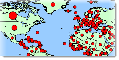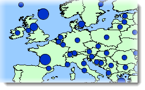 Las temáticas de símbolos proporcionales dibujan símbolos circulares superpuestos sobre el centro de los elementos que califican. El tamaño de los símbolos se determina por interpolación entre los valores mínimo y máximo del atributo.