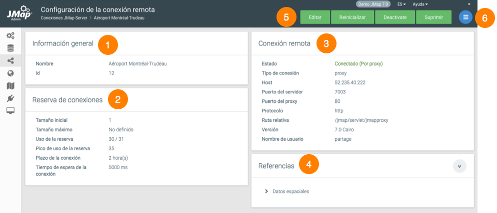 <table data-header-hidden><thead><tr><th width="74.5"></th><th></th></tr></thead><tbody><tr><td><strong>1</strong></td><td>Información general de la conexión.</td></tr><tr><td><strong>2</strong></td><td>Reserva de conexiones configurada al crear la conexión.</td></tr><tr><td><strong>3</strong></td><td>Información sobre la conexión y sobre el servidor remoto, configurada al crear la conexión.</td></tr><tr><td><strong>4</strong></td><td>Referencias. Esta sección indica las fuentes de datos espaciales que utilizan la conexión. Un clic sobre el nombre de la fuente lo lleva a la página de configuración de la misma.</td></tr><tr><td><strong>5</strong></td><td>Botones para editar, <a href="../gestion-de-las-conexiones#reinicializacion-de-las-conexiones">reinicializar</a>, <a href="../gestion-de-las-conexiones#desactivacion-de-las-conexiones-remotas">desactivar</a> o <a href="../gestion-de-las-conexiones#supresion-de-conexiones">suprimir</a> la conexión.</td></tr><tr><td><strong>6</strong></td><td>El menú permite acceder a la sección <a href="configuracion-de-las-conexiones-jmap-server-a-jmap-server/permisos-de-la-conexion-remota">Permisos</a> de la conexión remota.</td></tr></tbody></table>
