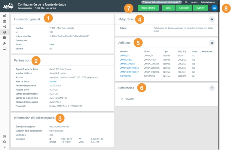 La interfaz de configuración de una fuente de datos espaciales permite acceder a la información sobre la misma así como a la configuración de parámetros tales como los metadatos, permisos y atributos.