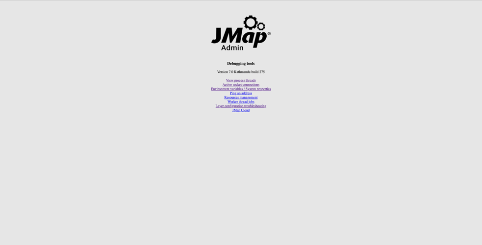 <table data-header-hidden><thead><tr><th width="263"></th><th></th></tr></thead><tbody><tr><td>View process threads</td><td>Ver los hilos de ejecución (thread) del servidor JMap, así como su estado.</td></tr><tr><td>Active sockets connexions</td><td>Ver el uso de socket del servidor donde está instalado JMap Server.</td></tr><tr><td>Environment variables / System properties</td><td>Ver las variables de entorno así como las propiedades del servidor donde está instalado JMap Server.</td></tr><tr><td>Ping an address</td><td>Permite enviar un ping desde el servidor donde está instalado JMap Server.</td></tr><tr><td>Resources management</td><td>Función utilizada para el desarrollo de JMap, permite administrar los archivos de traducción del código fuente de JMap.</td></tr><tr><td>Worker threads jobs</td><td>Ver hilos de trabajo activos y tareas pendientes del servidor JMap. Un subproceso se utiliza al actualizar una fuente de datos, almacenar en caché, calcular estadísticas, etc.</td></tr><tr><td>Layer configuration troubleshooting</td><td>Esta sección proporciona información sobre las capas de un proyecto, con el fin de identificar el origen de un problema con el funcionamiento de una aplicación JMap. La sección <a href="#layer-configuration-troubleshooting">Layer configuration troubleshooting </a>ofrece los detalles de esta herramienta.</td></tr><tr><td>JMap Cloud</td><td>Esta sección detalla en forma de tablas los archivos, fuentes de datos espaciales, proyectos y tareas que se comparten con JMap Cloud. Para cada recurso, se muestran datos como nombre, tipo, fecha de creación, ID.</td></tr></tbody></table>