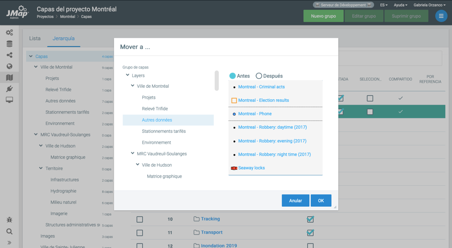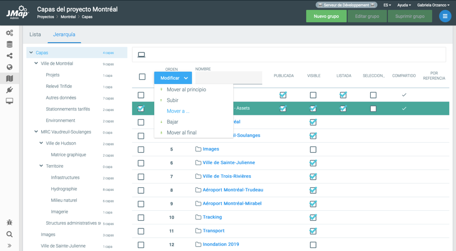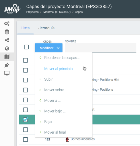Puede definir el orden de las capas de un proyecto en la pestaña del modo **Lista**. Esta sección presenta las capas en su orden de aparición. La capa en la posición inferior es la primera que se dibuja en el mapa. Para cambiar el orden debe utilizar el menú **Modificar** localizado en el encabezado de la columna que indica la posición de cada capa. Se puede seleccionar una o varias capas y, utilizando las opciones disponibles (mover hacia arriba, mover hacia abajo, mover a una posición precisa, etc.) moverlas a la posición deseada.