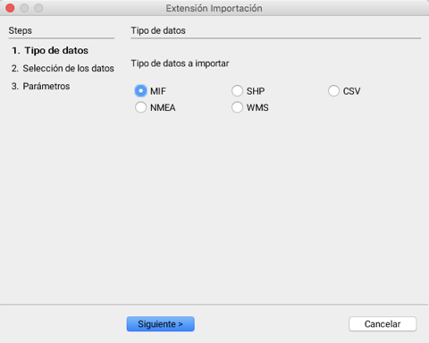 Cinco tipos de formatos de datos pueden ser importados: los archivos MIF, producidos en general por las aplicaciones MapInfo; los archivos SHP, producidos en general por las aplicaciones ESRI; los archivos CSV, archivos de texto con valores separados que corresponden a las coordenadas X e Y; datos provenientes de GPS estructurados según la norma NMEA; y datos matriciales provenientes de servidores compatibles con la norma WMS.