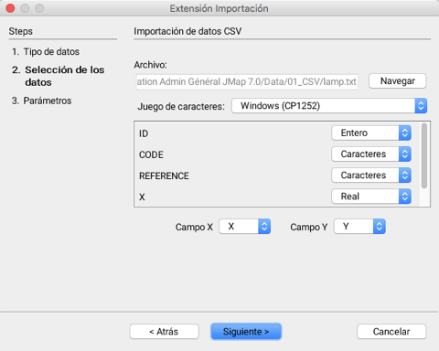La segunda etapa de la importación de datos de archivos CSV implica la selección del conjunto de datos que se desea importar así como su estructura.