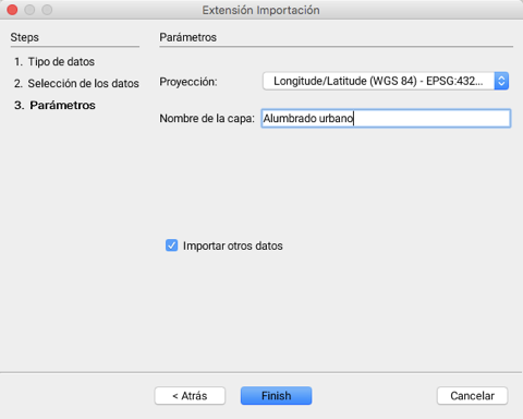 La tercera etapa permite configurar los parámetros de la capa que será generada como resultado de la importación de los datos.