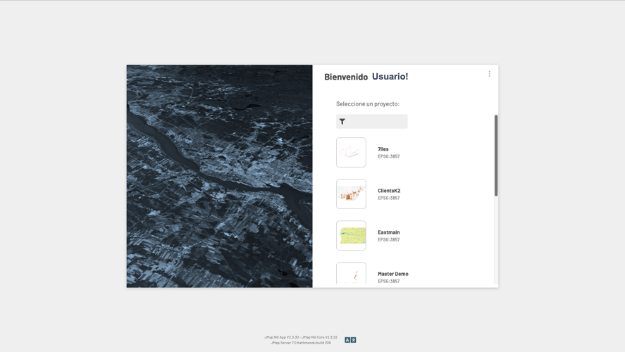 A la izquierda del icono <img src="https://885653957-files.gitbook.io/~/files/v0/b/gitbook-x-prod.appspot.com/o/spaces%2FYh8oZjLwxJoE6WF9N5oH%2Fuploads%2FECcgRwqPyRtn4HM6rbyN%2Flanguage.png?alt=media&#x26;token=ea3e5fe7-9327-4548-8d1d-76b53c508a13" alt="" data-size="line"> se presenta la versión de JMap NG así como la versión de JMap Server a la que se conecta la aplicación.\