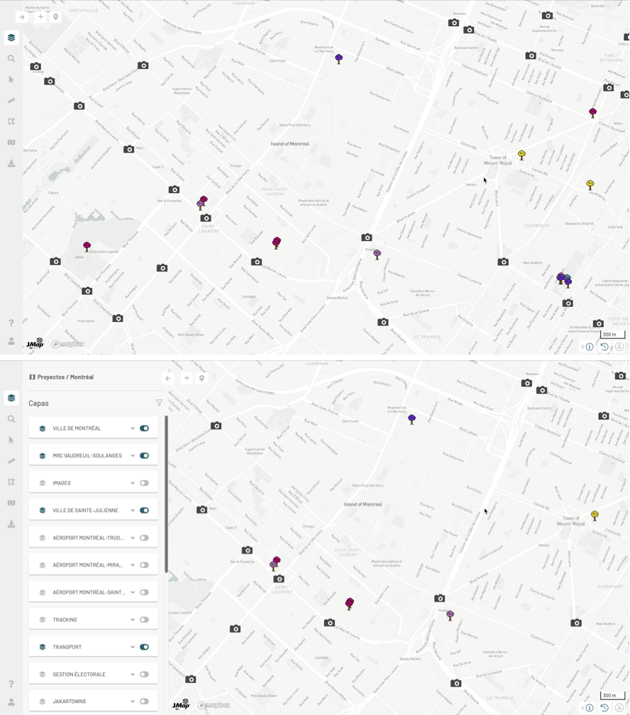 <table data-header-hidden><thead><tr><th width="97"></th><th></th></tr></thead><tbody><tr><td><p>​</p><p><img src="https://1947699634-files.gitbook.io/~/files/v0/b/gitbook-x-prod.appspot.com/o/spaces%2FfuLz2JT7jXRIRnUQEea1%2Fuploads%2FDoznnNN5Mn302m7B3xAp%2Farrow_r.png?alt=media&#x26;token=3dd388b1-95d7-4d5a-9956-fa8d7e451499" alt="img" data-size="original"></p><p>​</p></td><td><p>Flecha para abrir el panel. Cada panel presenta el nombre del proyecto abierto.</p><p><img src="https://1947699634-files.gitbook.io/~/files/v0/b/gitbook-x-prod.appspot.com/o/spaces%2FfuLz2JT7jXRIRnUQEea1%2Fuploads%2FsQzy14pCxb6WEWngKmAB%2Fclip006.png?alt=media&#x26;token=1571f863-4e8a-4be9-bf62-5327256fac8a" alt="" data-size="original"></p><p>Para cambiar de proyecto, presione <strong>Proyectos</strong>. La interfaz de los proyectos se abre y usted puede seleccionar un nuevo proyecto presionando sobre su nombre.</p></td></tr><tr><td><p>​</p><p><img src="https://1947699634-files.gitbook.io/~/files/v0/b/gitbook-x-prod.appspot.com/o/spaces%2FfuLz2JT7jXRIRnUQEea1%2Fuploads%2FNTW96F9t233vJAGGFQ8a%2Farrow_l.png?alt=media" alt="img" data-size="original"></p><p>​</p></td><td>Flecha para cerrar el panel.</td></tr><tr><td><p>​</p><p><img src="https://1947699634-files.gitbook.io/~/files/v0/b/gitbook-x-prod.appspot.com/o/spaces%2FfuLz2JT7jXRIRnUQEea1%2Fuploads%2F4M1wZxN6QcCbFZVC1jTF%2Fadd-element.png?alt=media&#x26;token=a9c2287d-0d3b-4c9a-a91a-c70d387ddeba" alt="img" data-size="original"></p><p>​</p></td><td>Presione este icono para añadir un elemento cartográfico a una capa editable. La sección <a href="../deseo.../editar-datos">Editar datos</a> detalla las funciones de edición disponibles.</td></tr><tr><td><p>​</p><p><img src="https://1947699634-files.gitbook.io/~/files/v0/b/gitbook-x-prod.appspot.com/o/spaces%2FfuLz2JT7jXRIRnUQEea1%2Fuploads%2F9fmmrA00Qp0aTVyAVEwZ%2Fsearch%20place.png?alt=media" alt="img" data-size="original"></p><p>​</p></td><td>Buscar un lugar. La sección <a href="navegar-en-el-mapa">Navegar en el mapa</a> detalla esta función.<br>Esta función solo está disponible cuando hay una clave API de Mapbox configurada en JMap Admin. Comuníquese con su administrador de JMap para obtener más detalles.</td></tr><tr><td><p>​</p><p><img src="https://1947699634-files.gitbook.io/~/files/v0/b/gitbook-x-prod.appspot.com/o/spaces%2FfuLz2JT7jXRIRnUQEea1%2Fuploads%2FAvtGbCpM1nf8yKh6kHLW%2Flayer.png?alt=media&#x26;token=a4860d13-b4b3-4cda-aec8-fbb041d78392" alt="img" data-size="original"></p><p>​</p></td><td>Presione este icono para abrir el panel <strong>Capas</strong>. La sección <a href="../los-datos">Los datos</a> detalla las funciones disponibles.</td></tr><tr><td><p>​</p><p><img src="https://1947699634-files.gitbook.io/~/files/v0/b/gitbook-x-prod.appspot.com/o/spaces%2FfuLz2JT7jXRIRnUQEea1%2Fuploads%2FUVhNwKPvYO4zQuGt2bUf%2Fsearch.png?alt=media&#x26;token=d948547b-caa9-498b-a8ef-4a6293d39f54" alt="img" data-size="original"></p><p>​</p></td><td>Presione este icono para abrir el panel <strong>Consulta</strong>. La sección <a href="../deseo.../consultar-los-datos">Consultar los datos</a> detalla las funciones disponibles.</td></tr><tr><td><p>​</p><p><img src="https://1947699634-files.gitbook.io/~/files/v0/b/gitbook-x-prod.appspot.com/o/spaces%2FfuLz2JT7jXRIRnUQEea1%2Fuploads%2Fyb9i8eqv22Jv3Poq6Bu0%2Fselect.png?alt=media&#x26;token=b0fd425d-9ebb-40c3-8e04-9b50d4893787" alt="img" data-size="original"></p><p>​</p></td><td>Presione este icono para abrir el panel <strong>Selección</strong>. La sección <a href="../deseo.../seleccionar-elementos-en-el-mapa">Seleccionar elementos en el map</a>a detalla las funciones disponibles.</td></tr><tr><td><p>​</p><p><img src="https://1947699634-files.gitbook.io/~/files/v0/b/gitbook-x-prod.appspot.com/o/spaces%2FfuLz2JT7jXRIRnUQEea1%2Fuploads%2FLwD0qiPLqGW6bhDIML0p%2Fmesure.png?alt=media&#x26;token=35a62ecc-fda7-40f3-a3eb-e040e6a637b1" alt="img" data-size="original"></p><p>​</p></td><td>Presione este icono para abrir el panel <strong>Mediciones</strong>. La sección <a href="../deseo.../medir-distancias-y-superficies">Medir distancias y superficies</a> detalla las funciones disponibles.</td></tr><tr><td><p>​</p><p><img src="https://1947699634-files.gitbook.io/~/files/v0/b/gitbook-x-prod.appspot.com/o/spaces%2FfuLz2JT7jXRIRnUQEea1%2Fuploads%2FaJk8Caddnu12uUIv3sjo%2Fannotation.png?alt=media&#x26;token=28d3d37c-acfc-41f4-b721-d57753a34dfa" alt="img" data-size="original"></p><p>​</p></td><td>Presione este icono para abrir el panel <strong>Anotaciones</strong>. La sección <a href="../deseo.../efectuar-anotaciones-en-el-mapa">Efectuar anotaciones</a> detalla las funciones disponibles.</td></tr><tr><td><p>​</p><p><img src="https://1947699634-files.gitbook.io/~/files/v0/b/gitbook-x-prod.appspot.com/o/spaces%2FfuLz2JT7jXRIRnUQEea1%2Fuploads%2Fa7V9ysuSW7MjL98XLlME%2Fcontext.png?alt=media&#x26;token=9e45f79a-0850-4427-8dd5-974fe14352da" alt="img" data-size="original"></p><p>​</p></td><td>Presione este icono para abrir el panel <strong>Mis mapas</strong>. La sección <a href="../deseo.../crear-y-administrar-mapas-personalizados">Crear y administrar mapas personalizados</a> detalla las funciones disponibles.</td></tr><tr><td><p>​</p><p><img src="https://1947699634-files.gitbook.io/~/files/v0/b/gitbook-x-prod.appspot.com/o/spaces%2FfuLz2JT7jXRIRnUQEea1%2Fuploads%2Ft9ASBZqf6TjtWni8UH1o%2Fprint.png?alt=media&#x26;token=95687d75-760b-4c89-a4bb-18ff88ebf6e1" alt="img" data-size="original"></p><p>​</p></td><td>Presione este icono para abrir el panel <strong>Exportar / Impresión</strong>. La sección <a href="../deseo.../exportar-imprimir-un-mapa">Exportar / Imprimir un mapa</a> detalla las funciones disponibles.</td></tr><tr><td><p>​</p><p><img src="https://1947699634-files.gitbook.io/~/files/v0/b/gitbook-x-prod.appspot.com/o/spaces%2FfuLz2JT7jXRIRnUQEea1%2Fuploads%2FpwPN7Ui2r9k2YyWVpJhq%2Fhelp.png?alt=media&#x26;token=1298a06a-8b2b-4d90-b3ee-d