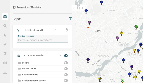7. Presione <img src="https://885653957-files.gitbook.io/~/files/v0/b/gitbook-x-prod.appspot.com/o/spaces%2FYh8oZjLwxJoE6WF9N5oH%2Fuploads%2F1UTJfav1w8k5s9SMHxoP%2Ffiltre-actif.png?alt=media&#x26;token=63daf8a4-51fc-4323-b3ac-4cbd2220d211" alt="img" data-size="line"> para eliminar el filtro de capa. Las capas aparecen en el panel **Capas**. Debe activar la visualización de las capas para verlas en el mapa.