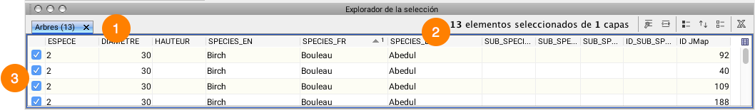 <table data-header-hidden><thead><tr><th width="76.5"></th><th></th></tr></thead><tbody><tr><td><strong>1</strong></td><td>Cada capa que contiene elementos seleccionados está representada por una pestaña. En ella se indican el nombre de la capa y el número de elementos seleccionados.</td></tr><tr><td><strong>2</strong></td><td>Un mensaje indica el número total de elementos seleccionados y el número de capas en las que éstos se encuentran.</td></tr><tr><td><strong>3</strong></td><td>Todos los elementos presentados están seleccionados. Si usted retira de la selección un elemento, éste desaparece de la tabla.</td></tr></tbody></table>