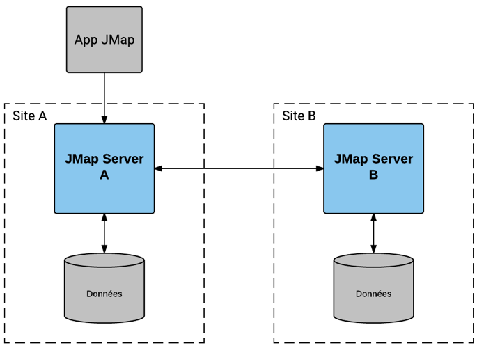 Le diagramme suivant représente la connexion entre 2 JMap Server (A et B) où l’application JMap, connectée au serveur A, accède à des données spatiales servies par une autre instance de JMap Server (serveur B).