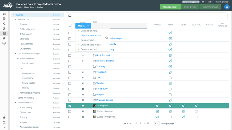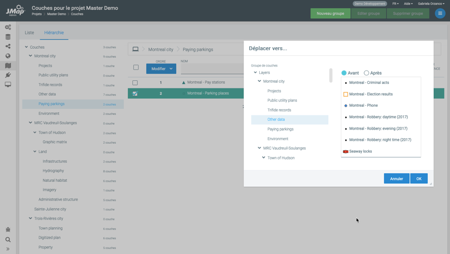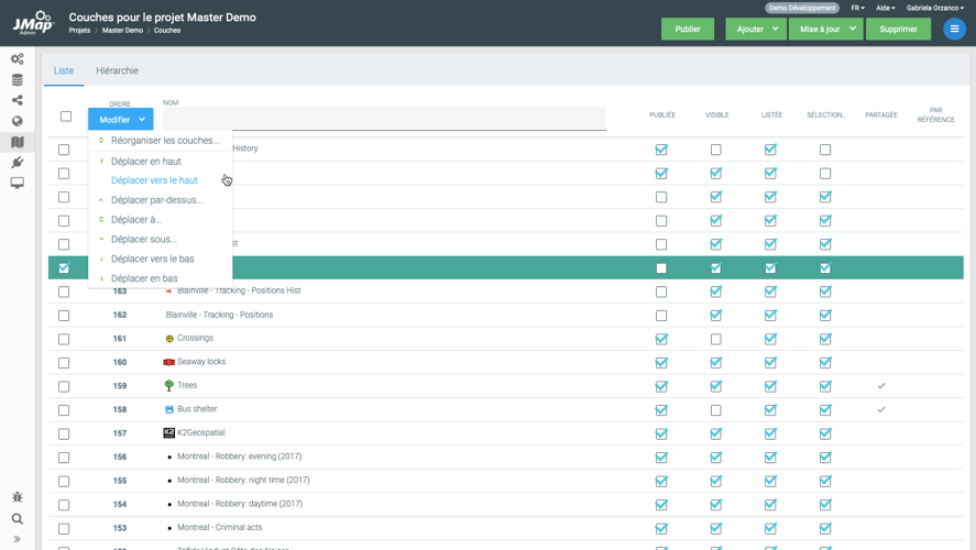 Afin de définir l’ordre des couches d’un projet, ouvrez l’onglet intitulé **Liste**. Cette section présente les couches dans leur ordre d’apparition sur la carte. La position la plus basse est la première qui est dessinée sur la carte. Afin de changer l’ordre, vous devez utiliser le menu **Modifier** localisé en haut de la colonne qui affiche la position de chaque couche. Il est possible de sélectionner une ou plusieurs couches et les déplacer en utilisant les options disponibles (déplacer vers le haut, déplacer vers le bas, déplacer vers une position précise, etc.).