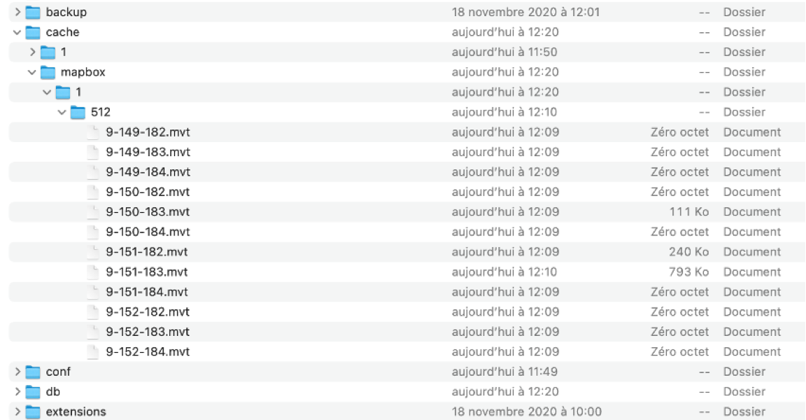 Que les tuiles soient créés à la demande ou à l'avance et mises en cache, elles sont créées dans le répertoire **cache/mapbox** de JMap Server. Dans ce répertoire il y a un dossier par projet (nommé avec l'identifiant du projet) qui contient un dossier par résolution (actuellement 512). Les fichiers des tuiles sont nommés suivant le code **z-x-y.mvt** où *z* est le niveau d'échelle, *x* et *y* indiquent la position de la tuile dans la grille.