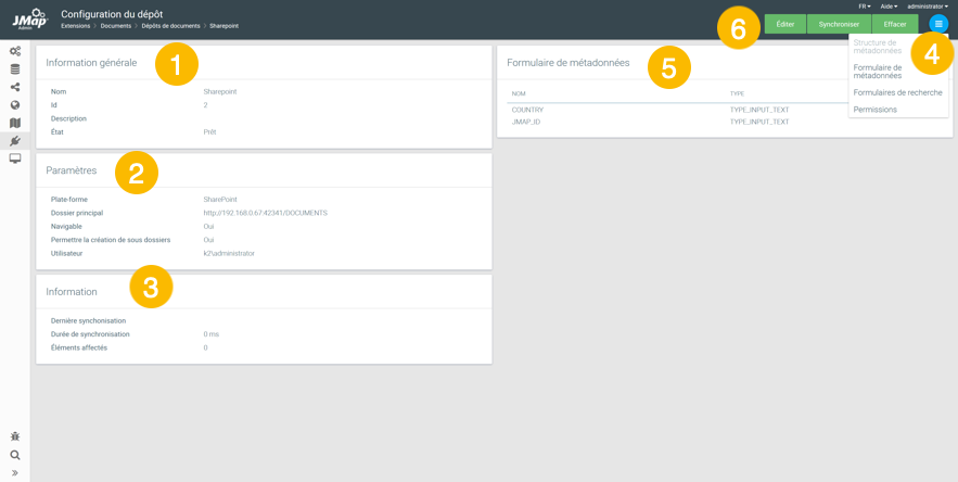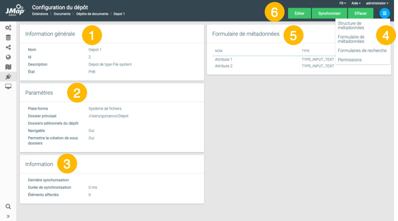 <table data-header-hidden><thead><tr><th width="89.37226277372264" align="center"></th><th></th></tr></thead><tbody><tr><td align="center"><strong>1</strong></td><td><strong>Information générale</strong><br>Présente de l'information sur le dépôt, telle que son nom, son Id, la description et l'état.</td></tr><tr><td align="center"><strong>2</strong></td><td><strong>Paramètres</strong><br>Présente de l'information détaillée sur les caractéristiques du dépôt.</td></tr><tr><td align="center"><strong>3</strong></td><td><strong>Information</strong><br>Présente des données liés à la synchronisation du dépôt.</td></tr><tr><td align="center"><strong>4</strong></td><td>Appuyez sur <img src="https://3048819513-files.gitbook.io/~/files/v0/b/gitbook-x-prod.appspot.com/o/spaces%2FbUcAjuZV4Pk5ljdFZZn6%2Fuploads%2Fgit-blob-d32f020d52154f84f85c6a4ce683045e47ec87ec%2Fclip_037.png?alt=media" alt=""> pour accéder aux interfaces de configuration de <a href="#configurer-la-structure-de-metadonnees">Structure de métadonnées</a>, <a href="#configurer-le-formulaire-de-metadonnees">Formulaire de métadonnées</a>, <a href="#configurer-les-formulaires-de-recherche">Formulaires de recherche</a> et <a href="#configurer-les-permissions">Permissions</a>.</td></tr><tr><td align="center"><strong>5</strong></td><td>Lorsque les formulaires de métadonnées sont configurés, ils s'affichent dans cette section.</td></tr><tr><td align="center"><strong>6</strong></td><td>Boutons pour <strong>Éditer</strong>, <a href="../gerer-les-depots#synchroniser-les-depots">Synchroniser</a> ou <strong>Effacer</strong> le dépôt.</td></tr></tbody></table>