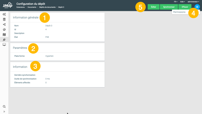 <table data-header-hidden><thead><tr><th width="75.37226277372264"></th><th></th></tr></thead><tbody><tr><td><strong>1</strong></td><td><strong>Information générale</strong><br>Présente de l'information sur le dépôt, telle que son nom, son Id, la description et l'état.</td></tr><tr><td><strong>2</strong></td><td><strong>Paramètres</strong><br>Présente de l'information détaillée sur les caractéristiques du dépôt.</td></tr><tr><td><strong>3</strong></td><td><strong>Information</strong><br>Présente des données liés à la synchronisation du dépôt.</td></tr><tr><td><strong>4</strong></td><td>Appuyez sur <img src="https://3048819513-files.gitbook.io/~/files/v0/b/gitbook-x-prod.appspot.com/o/spaces%2FbUcAjuZV4Pk5ljdFZZn6%2Fuploads%2Fgit-blob-d32f020d52154f84f85c6a4ce683045e47ec87ec%2Fclip_037.png?alt=media" alt=""> pour accéder à l'interface de configuration des <a href="#configurer-les-permissions">Permissions</a>.</td></tr><tr><td><strong>5</strong></td><td>Boutons pour <strong>Éditer</strong>, <a href="../gerer-les-depots#synchroniser-les-depots">Synchroniser</a> ou <strong>Effacer</strong> le dépôt.</td></tr></tbody></table>