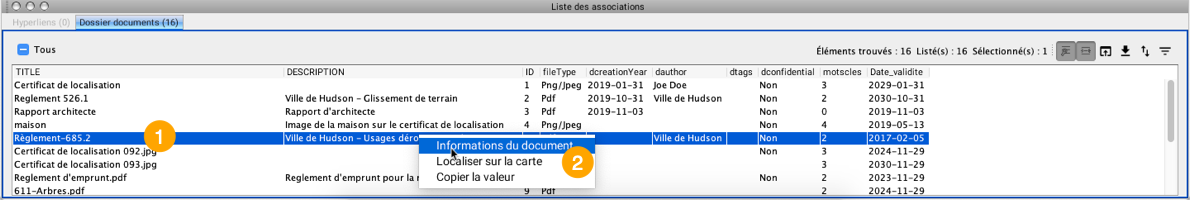 Les champs de la table correspondent aux métadonnées des documents listés dans les rangées. Les métadonnées sont configurées par l'administrateur JMap pour chaque dépôt de documents.