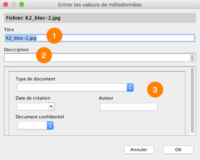 <table data-header-hidden><thead><tr><th width="81.89208633093526"></th><th></th></tr></thead><tbody><tr><td><strong>1</strong></td><td>Vous pouvez changer le nom du fichier. C'est une métadonnée par défaut des dépôts de documents en JMap Documents.</td></tr><tr><td><strong>2</strong></td><td>Vous pouvez ajouter une description du fichier.<br>C'est une métadonnée par défaut des dépôts de documents en Documents.</td></tr><tr><td><strong>3</strong></td><td>Des métadonnées spécifiques au dépôt sélectionné.</td></tr></tbody></table>