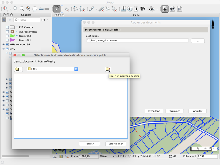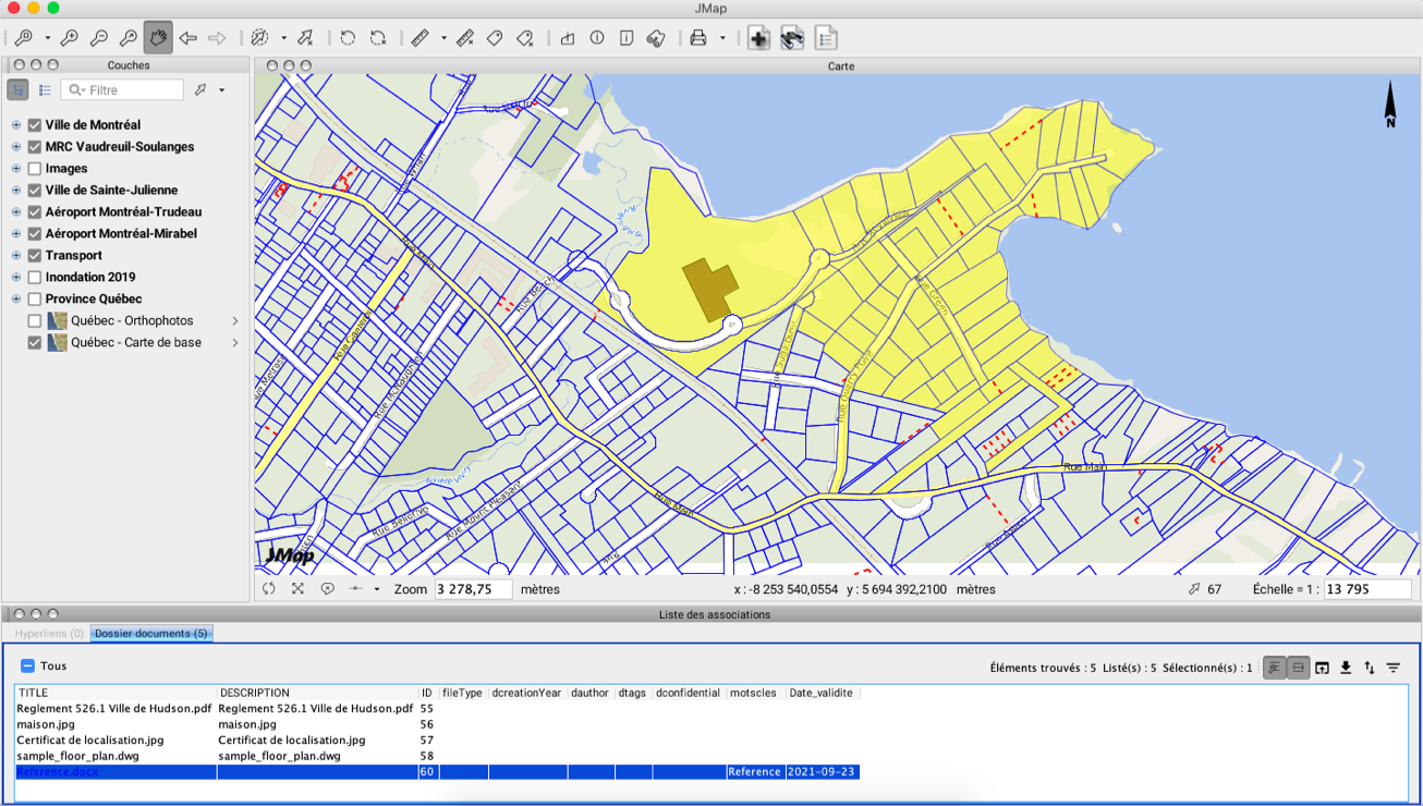 Cette fonction vous permet de créer des associations entre des éléments cartographiques des couches et des documents contenus dans un dépôt. Elle vous permet aussi d'ajouter un document à un dépôt existant pour l'associer par la suite aux éléments cartographiques.