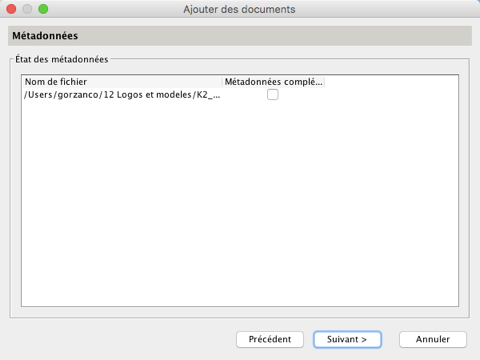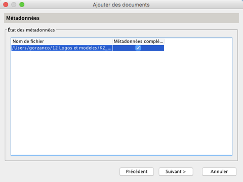 7. Cliquez **OK** pour retourner à l'interface des métadonnées du fichier. La case **Métadonnées complétées** est cochée et vous pouvez passer à l'étape suivante.