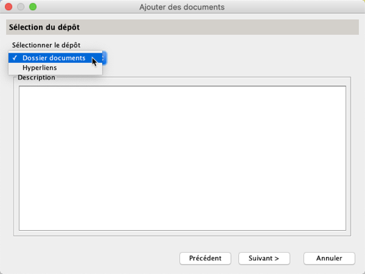 3. Cliquez **Suivant** pour sélectionner un dépôt dans lequel stocker le document à ajouter ou choisir le document à associer aux éléments cartographiques. Chaque dépôt peut avoir une description.