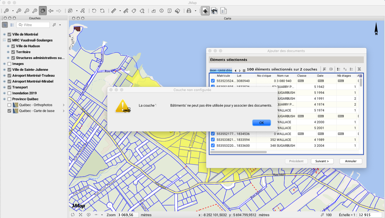 Si l'une des couches dont vous avez sélectionné des éléments n'est pas configurée pour y associer des éléments, un message d'erreur s'affiche et vous devez désélectionner les éléments de la couche pour pouvoir continuer.