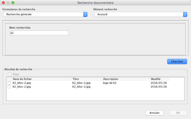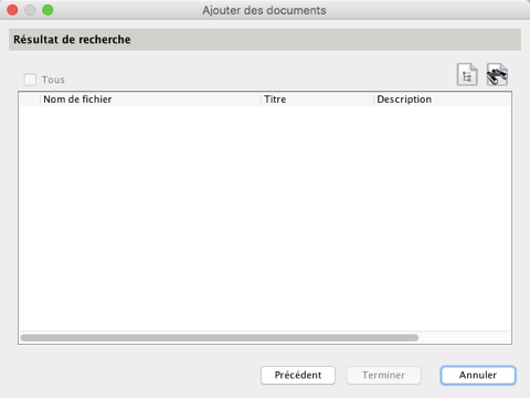 Les résultats de la recherche s'affichent dans un tableau qui indique quelques informations sur chaque document retrouvé.