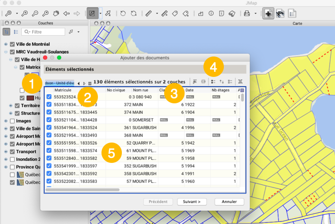 <table data-header-hidden><thead><tr><th width="80.62962962962962"></th><th></th></tr></thead><tbody><tr><td><strong>1</strong></td><td>Chaque onglet correspond à une couche qui contient des éléments cartographiques qui sont inclus dans la sélection.</td></tr><tr><td><strong>2</strong></td><td><p>Bouton pour accéder aux couches de manière directe.</p><p><img src="https://3048819513-files.gitbook.io/~/files/v0/b/gitbook-x-prod.appspot.com/o/spaces%2FbUcAjuZV4Pk5ljdFZZn6%2Fuploads%2Fgit-blob-7e3a5b74ceece485ef9ac5cd4a65777d4bbe0a97%2Fclip_042.png?alt=media" alt="" data-size="original"></p></td></tr><tr><td><strong>3</strong></td><td>Information sur le nombre d'éléments cartographiques sélectionnés et le nombre de couches auxquelles ils appartiennent.</td></tr><tr><td><strong>4</strong></td><td>Outils pour trier les éléments cartographiques, centrer la carte sur l'un d'eux, pour inverser la sélection, pour désélectionner les éléments et pour exporter les éléments sélectionnés vers un fichier Excel.<br>Ces outils sont semblables aux outils de l'explorateur d'éléments de JMap Pro.</td></tr><tr><td><strong>5</strong></td><td>Attributs des éléments sélectionnés.</td></tr></tbody></table>