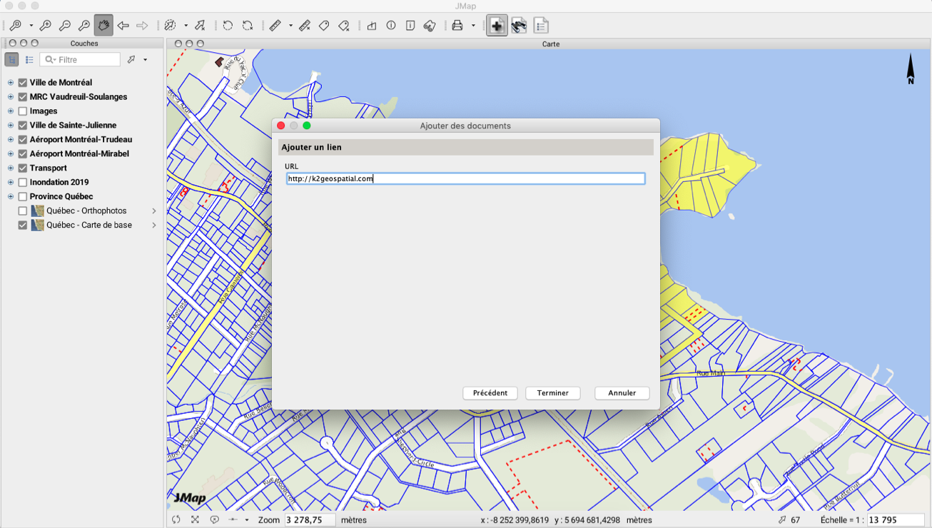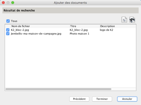 8. Cliquez **Terminer** pour associer les documents cochés aux éléments cartographiques sélectionnés. L'interface se ferme de manière automatique. Une table semblable à l'explorateur d'éléments s'affiche. La section [Chercher des documents](https://docs.k2geospatial.com/fr2/extensions-jmap-server/documents/guide-dutilisation-de-jmap-documents/documents-pour-jmap-pro/chercher-des-documents) offre les détails sur les composantes de la table.