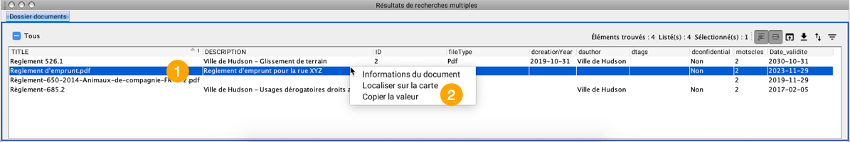 <table data-header-hidden><thead><tr><th width="71.73835125448028"></th><th></th></tr></thead><tbody><tr><td><strong>1</strong></td><td>Document sélectionné en cliquant sur sa rangée.</td></tr><tr><td><strong>2</strong></td><td>Menu contextuel s'ouvrant au clic du bouton droit et donnant accès à des fonctions pour travailler avec le document.</td></tr></tbody></table>