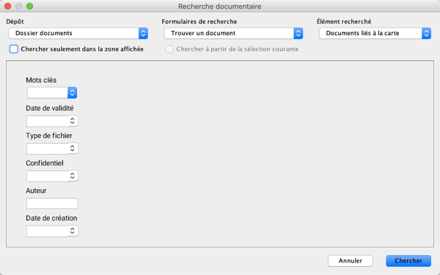 Si vous possédez les permissions pertinentes, vous pouvez effectuer des recherches de documents dans les différents dépôts au moyen de formulaires et de mots-clés. Vous n'avez pas besoin de sélectionner des éléments d'une couche.