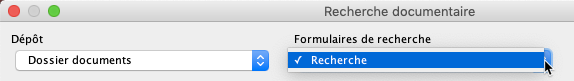 1. Cliquez sur le bouton <img src="https://3048819513-files.gitbook.io/~/files/v0/b/gitbook-x-prod.appspot.com/o/spaces%2FbUcAjuZV4Pk5ljdFZZn6%2Fuploads%2Fgit-blob-04d60a555a752fc560a19cc7993437b8143bb675%2Fchercher_documents.png?alt=media" alt="img" data-size="line"> **Chercher les documents** dans la barre d'outils de l'extension Documents pour ouvrir la fenêtre **Recherche documentaire**. Elle vous permet de configurer les termes de votre recherche.