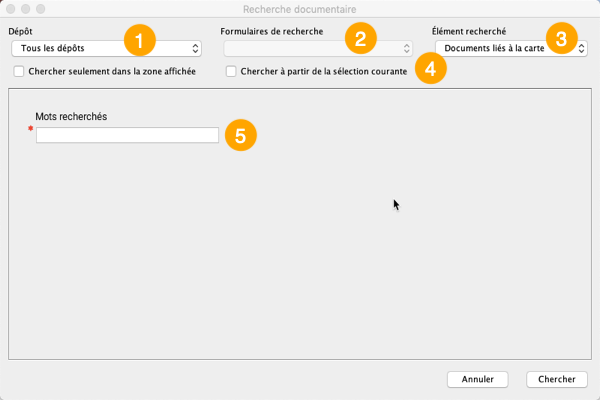 <table data-header-hidden><thead><tr><th width="87.30069930069928"></th><th></th></tr></thead><tbody><tr><td><strong>1</strong></td><td><p>Vous pouvez sélectionner le ou les dépôts dans lesquels effectuer la recherche.</p><p><img src="https://3048819513-files.gitbook.io/~/files/v0/b/gitbook-x-prod.appspot.com/o/spaces%2FbUcAjuZV4Pk5ljdFZZn6%2Fuploads%2Fgit-blob-280d7506e82de47ad75e5f7670264f839a93dbb8%2Fclip_014.png?alt=media" alt="" data-size="original"></p></td></tr><tr><td><strong>2</strong></td><td><p>Lorsque vous sélectionnez un dépôt vous disposez d'un ou de plusieurs formulaires configurés par l'administrateur.<br>Chaque dépôt contient des métadonnées spécifiques et les formulaires facilitent la recherche de documents dans leur intérieur.</p><p><img src="https://3048819513-files.gitbook.io/~/files/v0/b/gitbook-x-prod.appspot.com/o/spaces%2FbUcAjuZV4Pk5ljdFZZn6%2Fuploads%2Fgit-blob-4341881bce4a529781b4519c71b08a484131e451%2Fclip_016.png?alt=media" alt="" data-size="original"></p></td></tr><tr><td><strong>3</strong></td><td><p>Indiquez si les documents recherchés sont associés à des éléments cartographiques.</p><p><img src="https://3048819513-files.gitbook.io/~/files/v0/b/gitbook-x-prod.appspot.com/o/spaces%2FbUcAjuZV4Pk5ljdFZZn6%2Fuploads%2Fgit-blob-af136c5add5eb64e2eeb4667036f149954f4add3%2Fclip_015.png?alt=media" alt="" data-size="original"></p></td></tr><tr><td><strong>4</strong></td><td>Indiquez si la recherche concerne les documents associés aux éléments cartographiques affichés ou sélectionnés (si vous avez sélectionné des éléments).</td></tr><tr><td><strong>5</strong></td><td><p>Cette section contient le formulaire par défaut (des mots-clé) ou d'autres attributs disponibles pour la recherche, selon le dépôt sélectionné.</p><p><img src="https://3048819513-files.gitbook.io/~/files/v0/b/gitbook-x-prod.appspot.com/o/spaces%2FbUcAjuZV4Pk5ljdFZZn6%2Fuploads%2Fgit-blob-24f387d1a227115d7dbd9278b8d65aa7f6e3f4c9%2Fclip_051.png?alt=media" alt="" data-size="original"></p></td></tr></tbody></table>