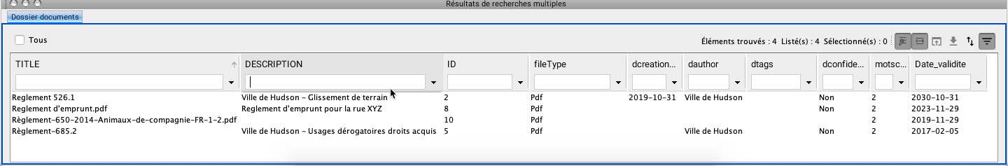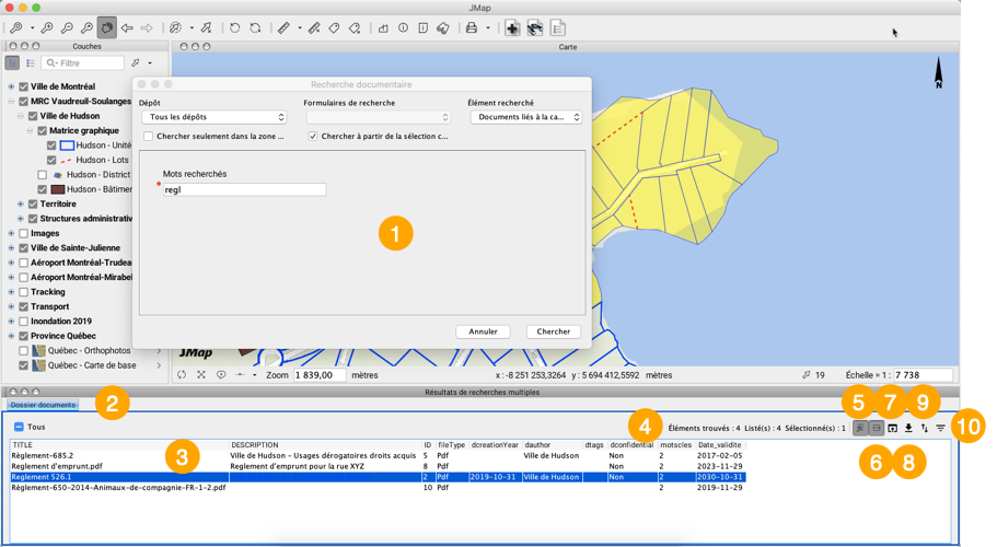 <table data-header-hidden><thead><tr><th width="75.19858156028369"></th><th></th></tr></thead><tbody><tr><td><strong>1</strong></td><td>Paramètres de la recherche.</td></tr><tr><td><strong>2</strong></td><td>Nom du dépôt de documents.<br>Plus d'un dépôt peut être ouvert, en fonction des documents identifiés par la recherche.</td></tr><tr><td><strong>3</strong></td><td>Les champs de la table correspondent aux métadonnées des documents listés dans les rangées.<br>Les métadonnées sont configurées par l'administrateur JMap pour chaque dépôt de documents.</td></tr><tr><td><strong>4</strong></td><td>Des informations sur le nombre de documents trouvés, listés et sélectionnés sont affichées dans l'entête de la table.</td></tr><tr><td><strong>5</strong></td><td>Bouton pour zoomer sur les éléments qui sont associés aux documents sélectionnés.</td></tr><tr><td><strong>6</strong></td><td>Bouton pour mettre en surbrillance les éléments qui sont associés aux documents sélectionnés.</td></tr><tr><td><strong>7</strong></td><td>Bouton pour ouvrir le document sélectionné dans l'application désignée par défaut.<br>Vous pouvez aussi ouvrir le document en faisant un double-clic sur sa rangée.<br>Le document est sauvegardé dans un répertoire temporaire. Vous pouvez ouvrir un seul document à la fois de cette manière.</td></tr><tr><td><strong>8</strong></td><td>Bouton pour télécharger les documents sélectionnés.<br>Vous pouvez sélectionner et télécharger plusieurs documents à la fois, l'ensemble est sauvegardé dans un format .zip dans le répertoire de votre choix.</td></tr><tr><td><strong>9</strong></td><td>Bouton pour exporter la liste des documents vers un fichier Excel.</td></tr><tr><td><strong>10</strong></td><td><p><img src="https://3048819513-files.gitbook.io/~/files/v0/b/gitbook-x-prod.appspot.com/o/spaces%2FbUcAjuZV4Pk5ljdFZZn6%2Fuploads%2Fgit-blob-1882b6674057d68aeabedbf07ffe7b0175bbff2d%2Ffiltre%20(1).png?alt=media" alt="" data-size="original"> Bouton pour filtrer les documents en fonction des valeurs de chaque métadonnée.</p><p><img src="https://3048819513-files.gitbook.io/~/files/v0/b/gitbook-x-prod.appspot.com/o/spaces%2FbUcAjuZV4Pk5ljdFZZn6%2Fuploads%2Fgit-blob-c8b64a3001030e9fd924c84a710f8a38019d7b20%2Fclip_018.png?alt=media" alt="" data-size="original"></p></td></tr></tbody></table>