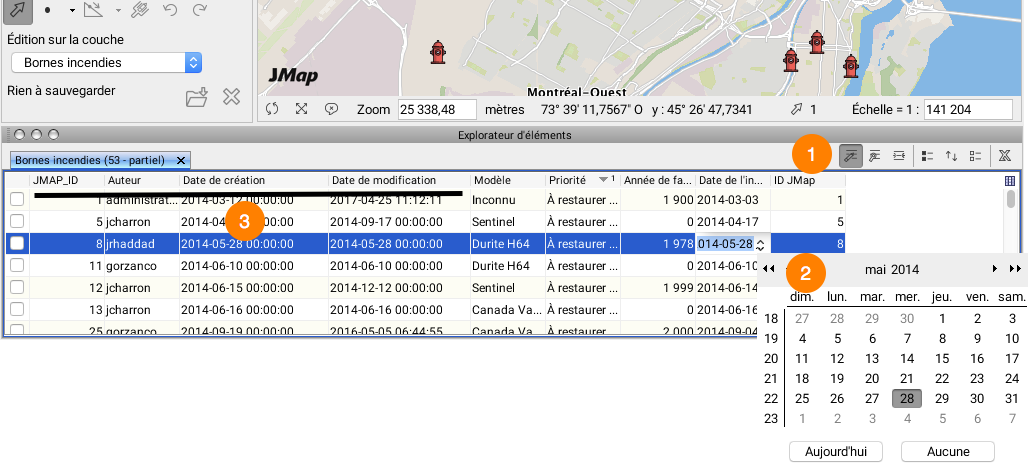 <table data-header-hidden><thead><tr><th width="74.2394366197183"></th><th></th></tr></thead><tbody><tr><td><strong>1</strong></td><td>L'activation du bouton de modification <img src="https://3048819513-files.gitbook.io/~/files/v0/b/gitbook-x-prod.appspot.com/o/spaces%2FbUcAjuZV4Pk5ljdFZZn6%2Fuploads%2Fgit-blob-eec9cf33b0d97df83ff8b30c96a61f2e8924dafe%2Fedit_attributes_18x18.png?alt=media" alt=""> rend les cellules modifiables.</td></tr><tr><td><strong>2</strong></td><td>Cliquez dans une cellule modifiable afin de saisir la nouvelle valeur de l'attribut.<br>Certaines cellules comportent des interfaces de saisie particulières (calendrier pour un attribut de type date).<br>Des règles de validation sur le type de données saisies sont appliquées à la fin de la saisie.</td></tr><tr><td><strong>3</strong></td><td>Certains attributs dits "système" ne sont pas modifiables.<br>Ces attributs sont renseignés automatiquement par JMap Server et sont utilisés pour des fins de gestion.</td></tr></tbody></table>