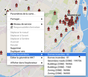 Il est aussi possible d'ouvrir le formulaire de saisie des attributs en cliquant avec le bouton de droite sur un élément de la carte.