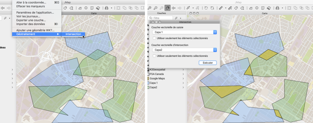 1. Sélectionnez la fonction Intersection dans le menu **Outils -> Géotraitement**.