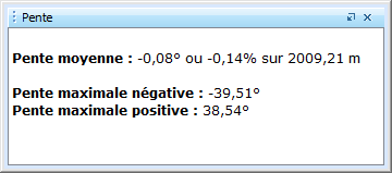 <table data-header-hidden><thead><tr><th width="238.29268292682923"></th><th></th></tr></thead><tbody><tr><td>Pente moyenne</td><td>Pente moyenne calculée entre les deux points, initial et final. Les résultats sont présentés en degré et en pourcentage.<br>La distance séparant les deux points est également présentée.</td></tr><tr><td>Pente maximale négative</td><td>Pente maximale négative observée entre les deux points, initial et final.</td></tr><tr><td>Pente maximale positive</td><td>Pente maximale positive observée entre les deux points, initial et final.</td></tr></tbody></table>